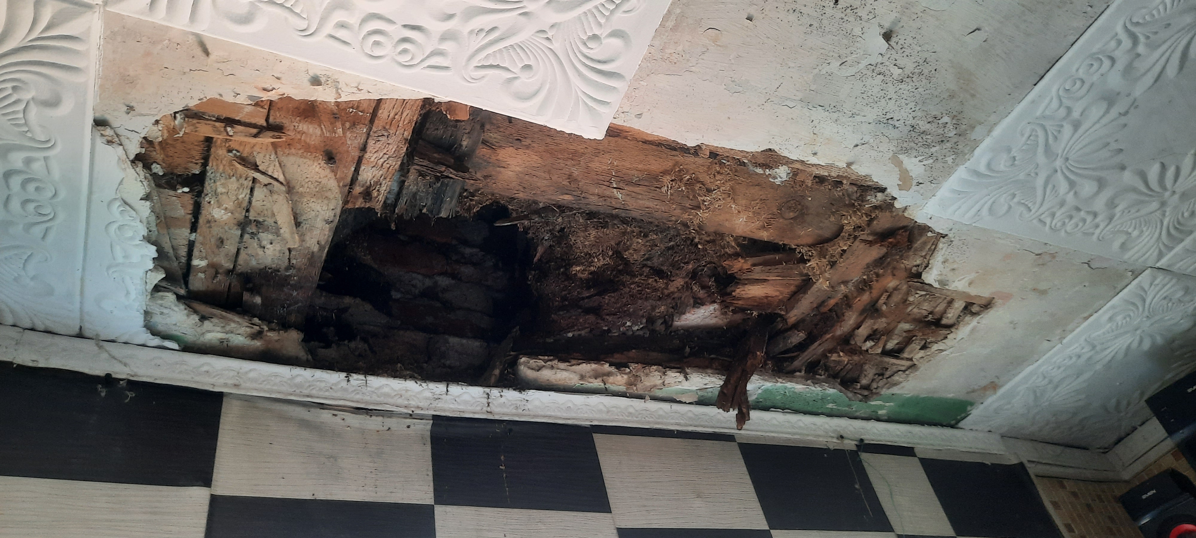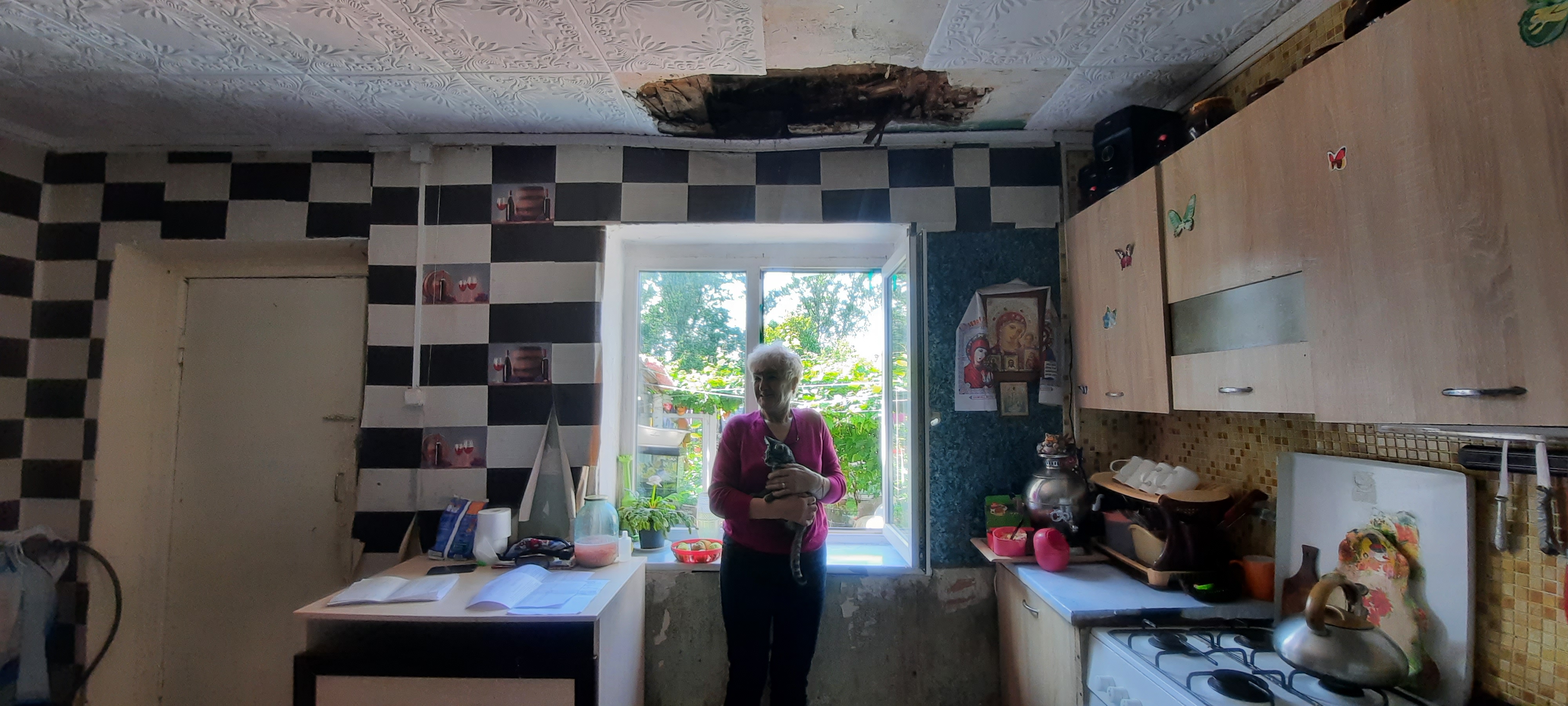 В кухне на потолке огромная дыра. Крыша уже несколько лет в таком состоянии, вздыхает Татьяна. У нее четверо детей и два внука. В этой квартире живет с 1980 года – с того момента, как приехала в Балтийск с мужем-военным.