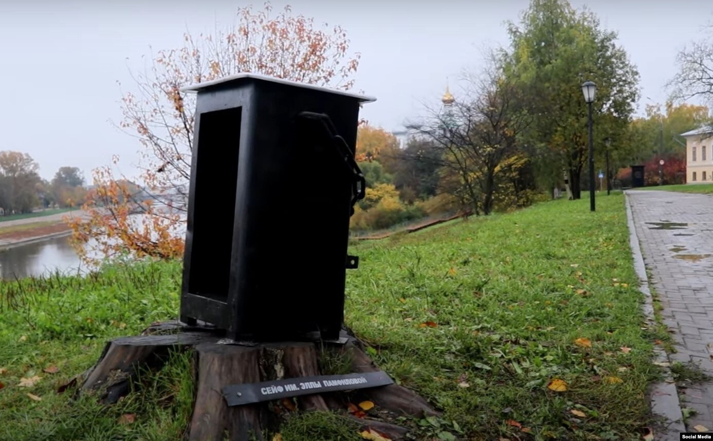 На Соборной горке в Вологде появился сейф имени главы Центральной избирательной комиссии России Эллы Памфиловой. Арт-объект - это черный сейф с массивной цепью, но без задней стенки. Установил его вымышленный персонаж - "председатель Среднего Посада Вологды Олег Графинов".