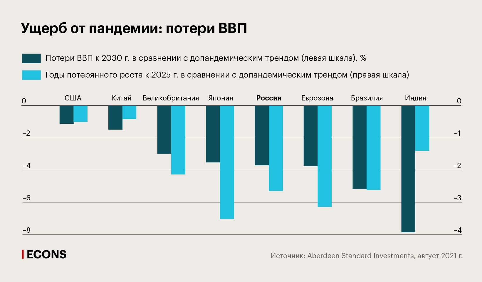 В совокупности все эти факторы, по оценке авторов, приведут к тому, что из-за коронакризиса потери для экономики России к 2025 году составят, в сравнении с допандемическим трендом, почти три года роста: то есть в 2025 году ВВП страны будет на том уровне, который, не случись пандемия, соответствовал бы 2022 году. Еще через пять лет, к 2030 году, разрыв ВВП с докризисной траекторией все еще будет составлять 4% — что эквивалентно примерно двум годам роста средним за три докризисных года темпом (за 2017–2019 годы среднегодовой рост экономики России составил 2,2%).