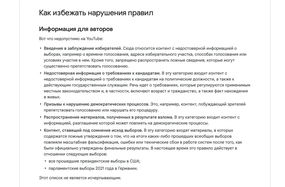 Также теперь запрещен контент с ложными утверждениями о фальсификациях и технических сбоях на выборах в Германии. Запрещены и заявления о неправомерности формирования нового правительства Германии. Публикация видео, нарушающих правила, может быть разрешена, если в контенте содержатся опровержения спорных утверждений или если видео созданы с целью осудить или оспорить недостоверную информацию.