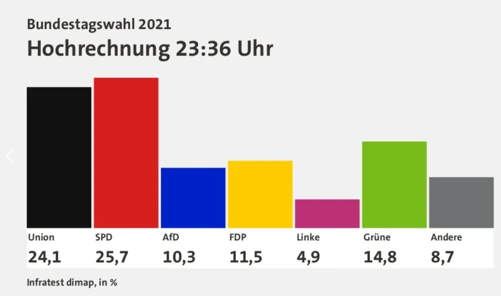Всего по спискам в бундестаг впервые за 16 лет проходят 5 партий. Помимо социал-демократов и консервативного блока, это «Союз 90 / Зеленые» (14,8%, лидер — Анналена Бербок) Свободная демократическая партия (11,5%, лидер — Кристиан Линднер), «Альтернатива для Германии» (10,3%, лидеры — Алиса Вайдель и Тино Хрупалла) и «Левые» (4,9%, лидеры — Жанин Висслер и Дитмар Барч). Последние не преодолели барьер в 5%, но проходят в парламент, так как получили три прямых мандата в избирательных округах — Грегор Гизи и Гезине Летч в Берлине и Серен Пельманн — в Лейпциге.