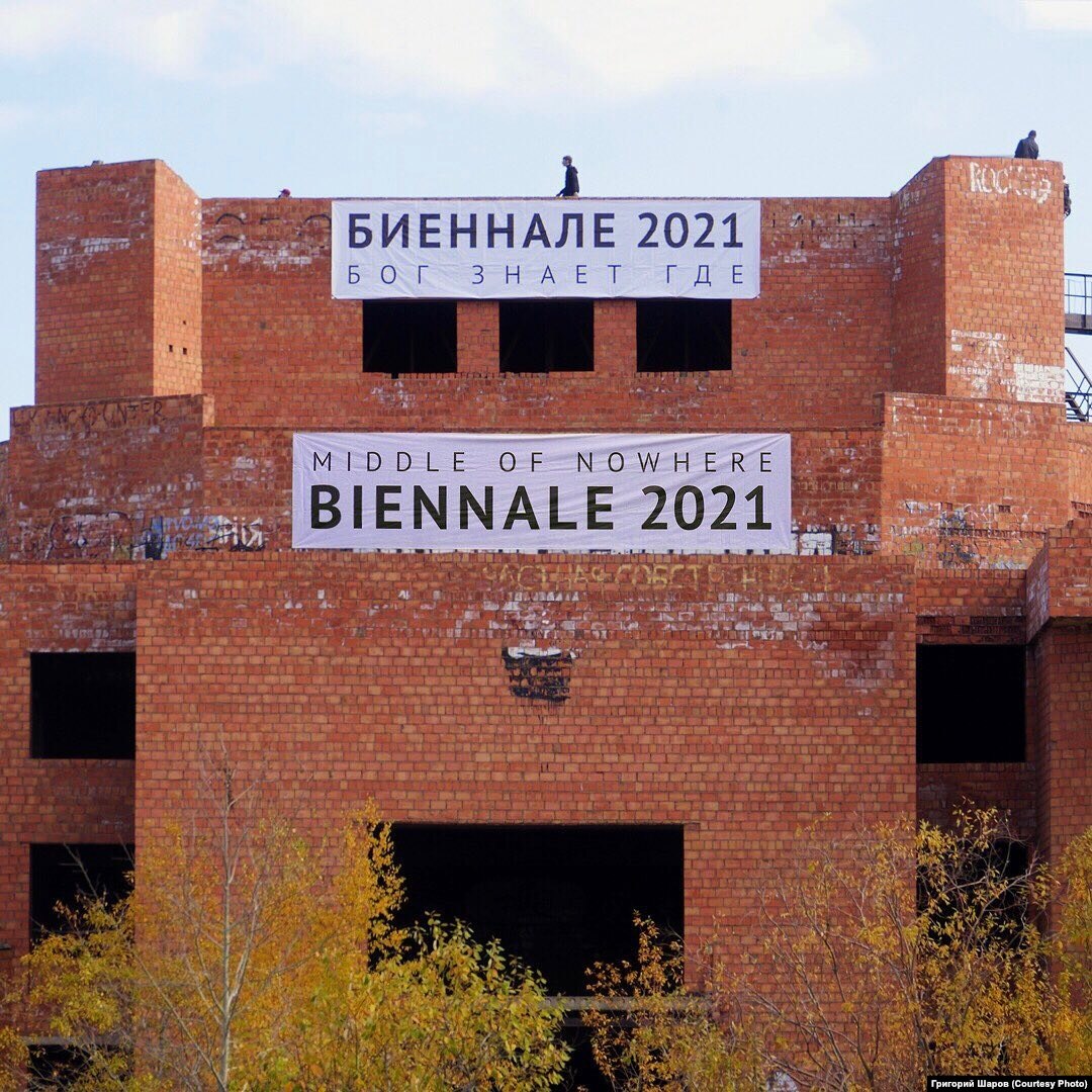 В Братске состоялось открытие Биеналле "Бог знает где". На нем нет предметов искусства, но есть недостроенное здание с баннерами об открытии выставки - это уличная инсталляция итальянского художника Vlady. Он стал одним из участников фестиваля, организованного братским художником Григорием Шаровым.