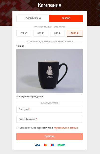 Новое расширение позволяет добавлять в форму «Лейки» фотографии и описание вознаграждений, которые донор получит, если сделает пожертвование на определенную сумму. Дополнительную контактную информацию о доноре (телефон, адрес для отправки вознаграждения) вы можете собрать с помощью специальных полей.