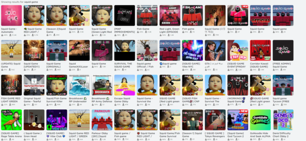 Фанатские игры, основанные на тех же смертельных испытаниях, что и в Squid Game, начали появляться на игровой платформе Roblox. В сообществе, посвящённому сериалу, состоит больше 33 тысяч человек, а поиск по сайту показывает десятки игр по его мотивам.