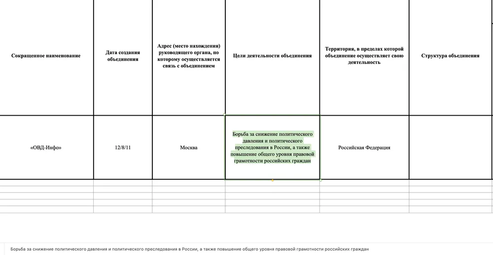 «Цели деятельности объединения: борьба за снижение политического давления и политического преследования в России, а также повышение общего уровня правовой грамотности российских граждан», — говорится в таблице минюста.