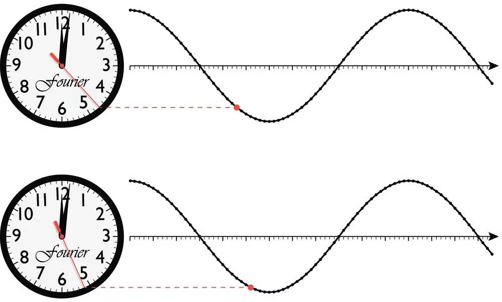 Визуализация волны по аналогии с движением стрелки по циферблату. Источник: с. 16 книги