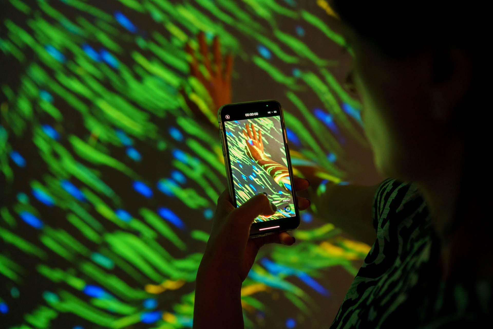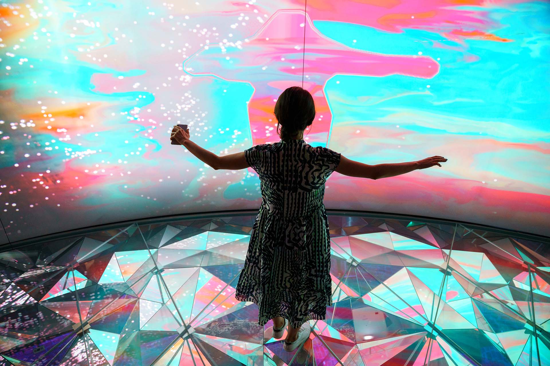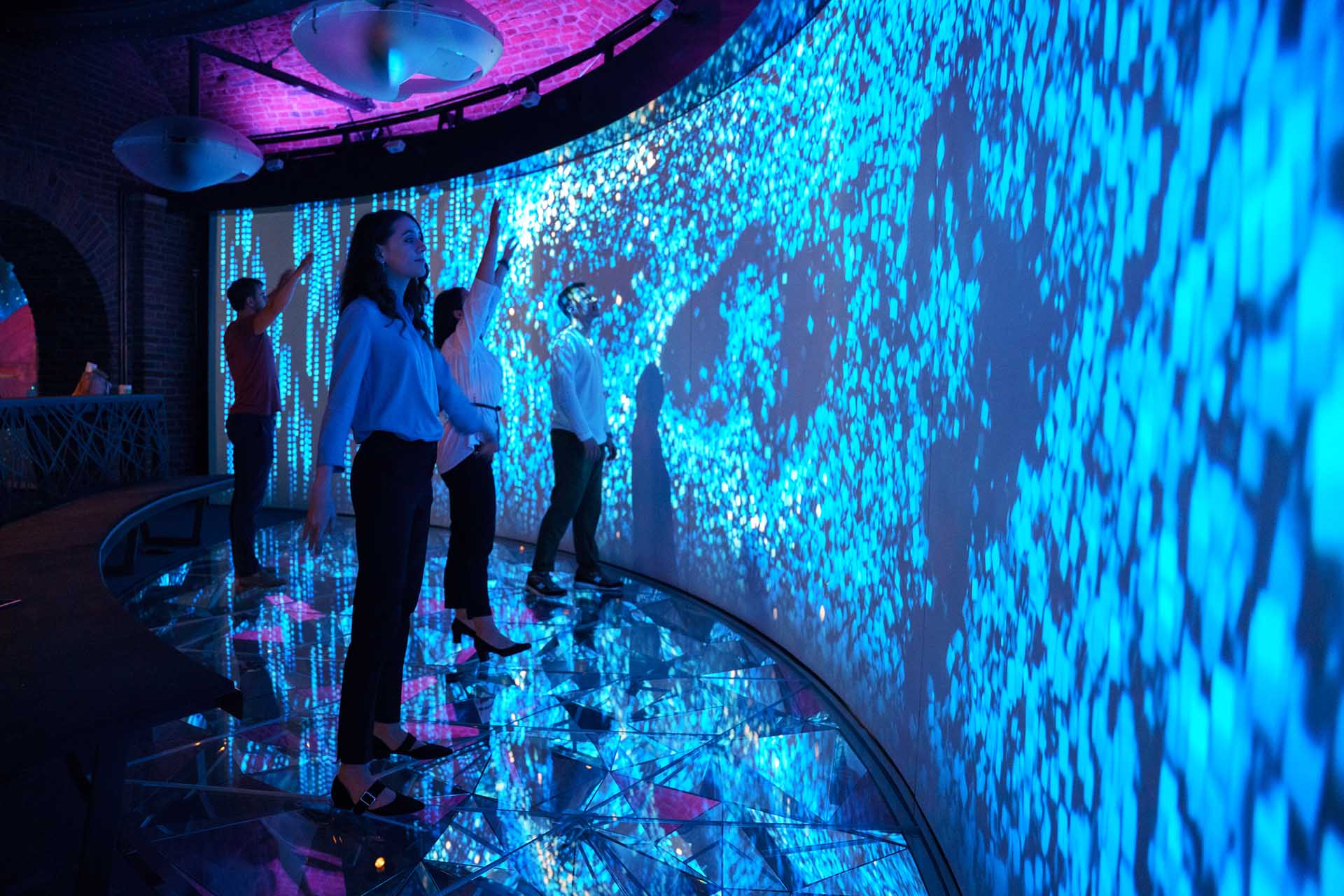 Первый проект на площадке — «Цифровые двойники». Данные о посетителях обрабатываются с помощью сенсоров нейросети, после чего жесты и шаги преобразуют в разноцветные элементы на экранах. Инсталляция доступна до 30 ноября.