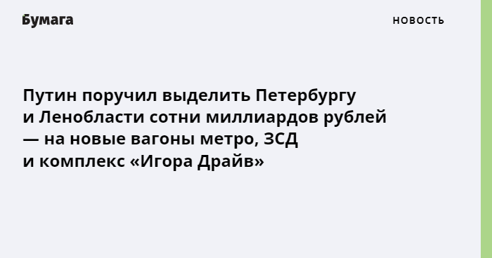 В частности, президент попросил выделить из федерального бюджета 6 миллиардов рублей для подключения ЗСД к Широтной магистрали и создания транспортной развязки с Витебским проспектом. Планируется, что город получит по 3 миллиарда в 2022 и 2023 годах.