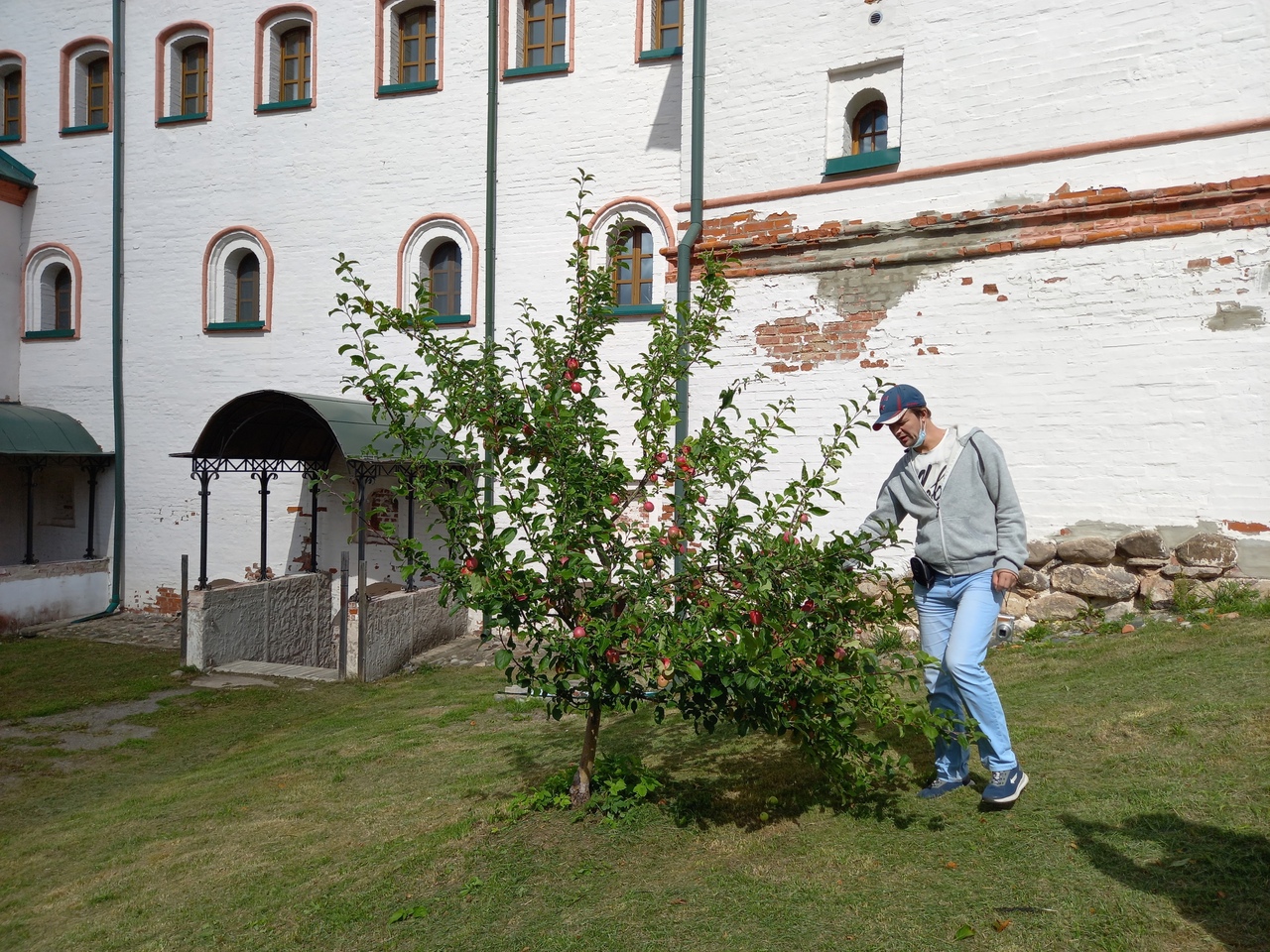 За храмом притаилась маленькая яблонька. А яблоки на ней уже висят вовсю, хоть она и мала ростом. Мы взяли попробовать пару штук. Для меня это имело особое значение: за два дня до поездки я сильно отравился чем-то и живот работал плохо. Надеялся на святое монастырское яблочко. И это сработало - после того, как я его съел, тяжесть из живота ушла и он больше не болел!