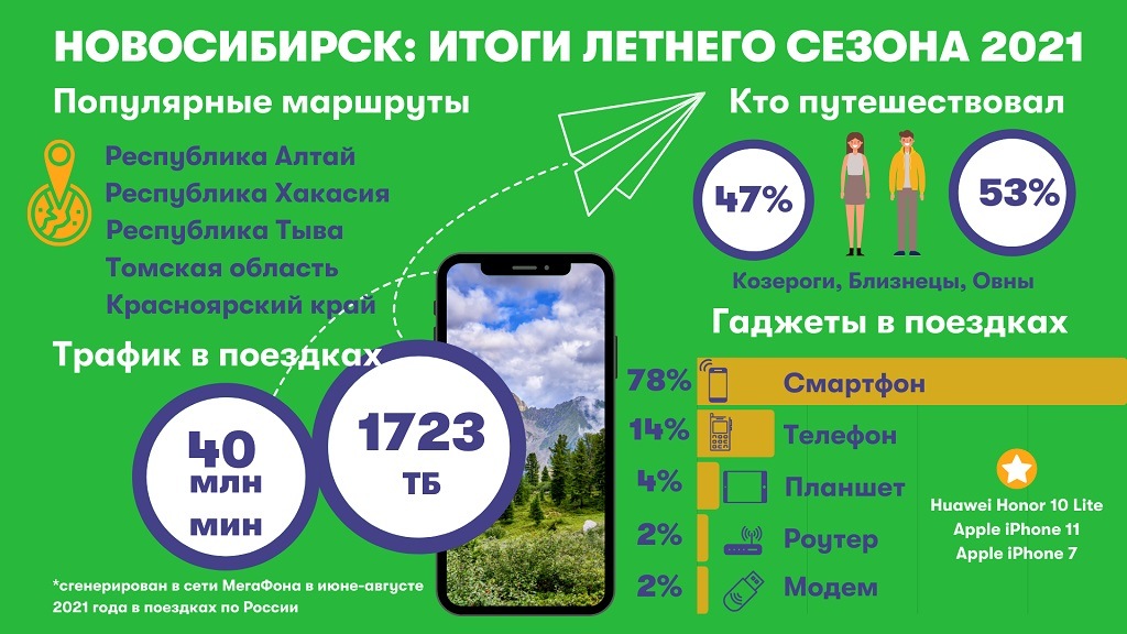 «Абоненты из Новосибирской области любят отдыхать летом недалеко от родного региона, что подтверждает растущий трафик в соседних городах. Инфраструктура связи от Новосибирска до Хакасии дает возможность комфортно пользоваться привычными онлайн-сервисами в дороге, на отдыхе. Активное строительство сети 4G позволило увеличить скорость передачи данных в популярных городах Сибири в среднем на 13%», — комментирует директор Сибирского филиала компании «МегаФон» Галия Сайфутдинова.