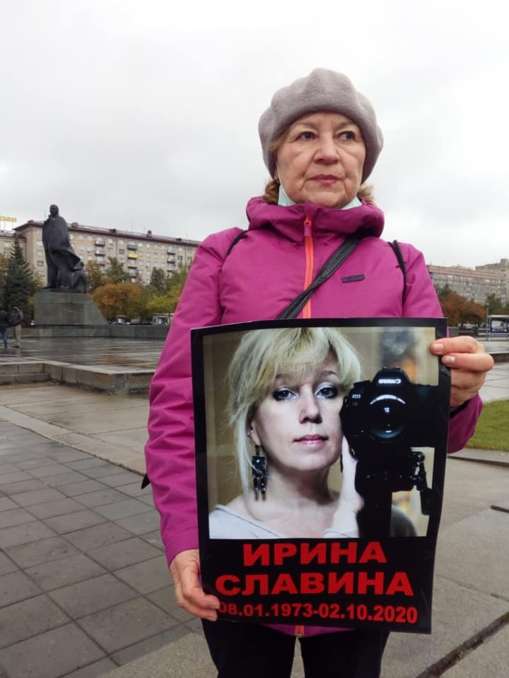 Одиночный пикет памяти Ирины Славиной прошел на площади Ленина в центре Новосибирска. Член «Яблока» Александра Налобина встала с плакатом «Ирина Славина, 08.01.1973 - 02.10.2020».