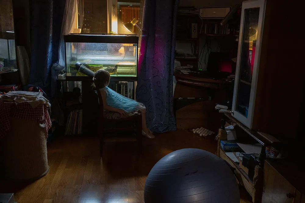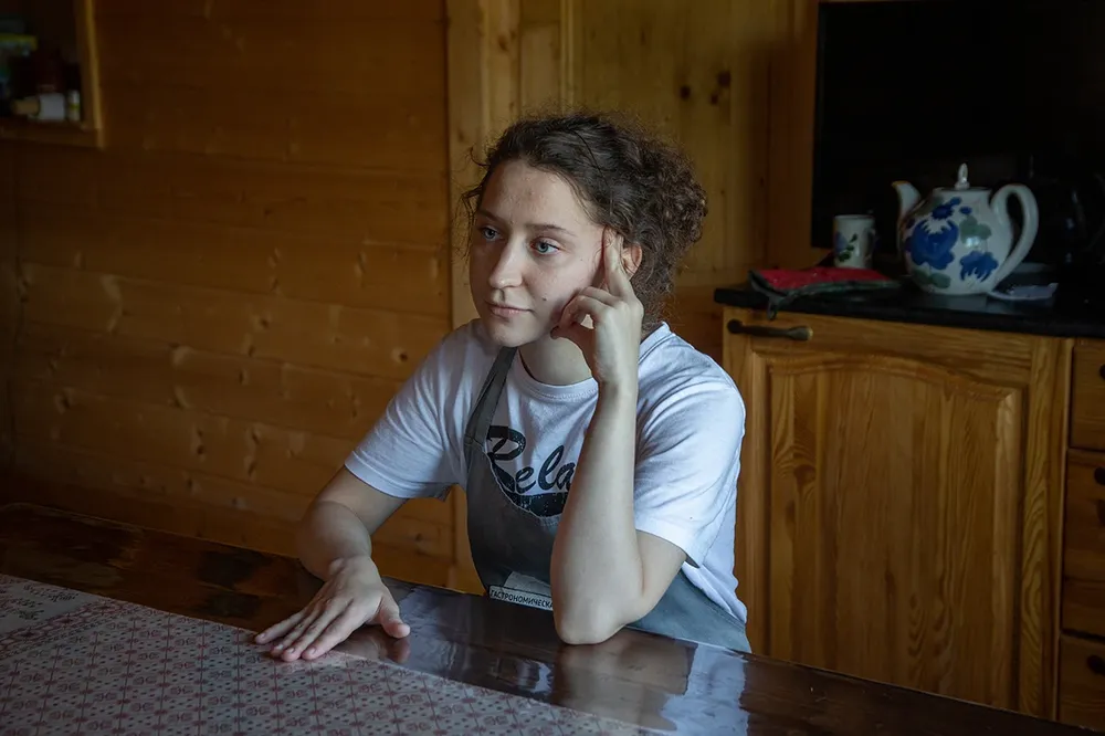 Саша сидит в столовой, пока на кухне варится уха. Пахнет деревом и едой. В ее светлых глазах блестит вечернее солнце, а об ноги трется кот — он ждет рыбу, которую не получит.