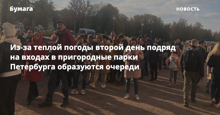 В субботу и воскресенье, 2 и 3 октября, на входах в пригородные парки Петербурга и Ленобласти — многометровые очереди из желающих попасть внутрь. Об этом сообщают очевидцы в соцсетях.