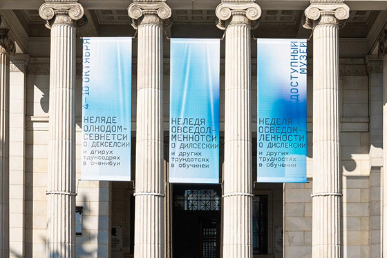 Как сообщает пресс-служба ГМИИ, в течении нескольких дней на фасаде Главного здания музея можно увидеть баннеры с нарушенной последовательностью букв, передающие трудности восприятия текста человеком с дислексией.