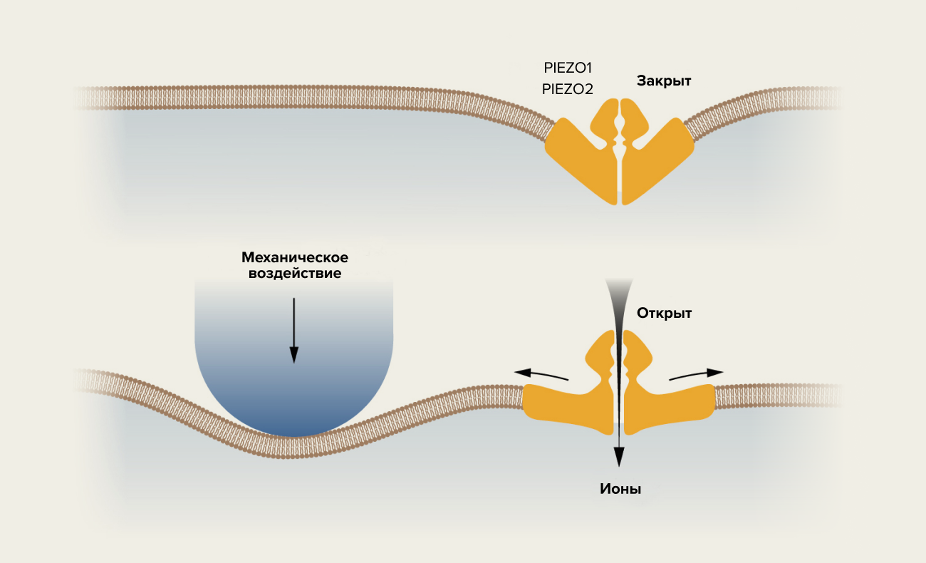 Именно таким образом удалось обнаружить ген, отключение которого полностью лишает клетки реакции на прикосновение. Точнее даже, это не один, а целое семейство генов, первыми и главными из которых стали PIEZO1 и PIEZO2. Из дальнейших экспериментов, в которых удалось установить трехмерную структуру этих рецепторов, стало понятно, как они работают: при нажатии клеточная мембрана растягивается, а вместе с ней растягивается и начинает пропускать ионы рецептор. Попадание же ионов в нервную клетку, конечно, ведет к его активации и формированию нервного импульса. Неизвестных подробностей о работе PIEZO1 и PIEZO2, конечно, осталось еще много, но эта механическая часть стала гораздо понятнее.
