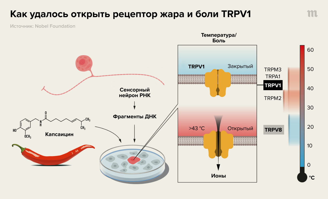 Тогда ученые во главе с Давидом Джулиусом выделили из известных чувствительных к капсаицину нейронов всю имеющуюся РНК, получив таким образом «библиотеку» всех работающих в этих клетках генов. Они не стали брать все гены, содержащиеся в геноме человека вообще (перебор такого масштаба был бы очень сложным и потенциально безрезультатным), а использовали только те гены, что существовали в нейронах в форме РНК. То есть такие, что действительно работали, а не «спали». Затем гены из этой библиотеки вставляли индивидуально в растущие на чашках клетки, добавляли специальное вещество-маркер, светящееся при высокой концентрации ионов кальция, и воздействовали на клетки капсаицином. Из тех образцов, что под действием капсаицина начинали неожиданно светиться, затем выделяли ДНК, в которой и находился ген термочувствительности. Он получил название TRPV1: TRP — это структурное семейство рецепторов (открытие которого у дрозофил, сделанное раньше, Нобелевский комитет на этот раз почему-то не отметил), а V1 или VR1 — это название рецептора.