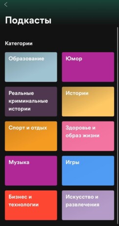 Подкасты представлены в нескольких категориях — образование, юмор, истории, спорт и отдых, музыка, игры, реальные криминальные истории, бизнес и технологии, здоровье и образ жизни и искусство и развлечения.