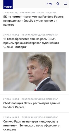- Агентство ТАСС не опубликовало ни одной заметки о россиянах, упоминаемых в «Архиве Пандоры». О них не написали и в новости с комментарием пресс-секретаря президента Дмитрия Пескова о публикации расследования. Издание рассказало только о мировых лидерах, чиновниках и деятелях шоу-бизнеса.
