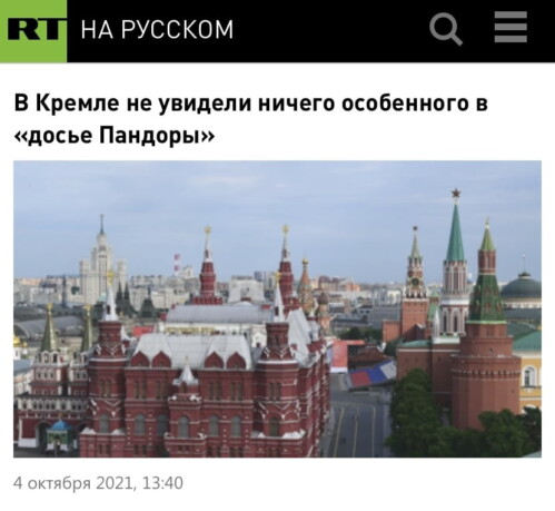 - На сайте RT есть восемь заметок о расследовании: новость об обнародовании данных журналистами и комментарий Пескова; мнение Александра Ионова, потребовавшего признать авторов «Архива Пандоры» нежелательной организацией; новость о реакции канцелярии короля Иордании на информацию о его недвижимости в США и Британии; заметка об упоминании в расследовании главного тренера «Манчестер Сити» Хосепа Гвардиола, а также президента Украины Владимира Зеленского, США как «крупнейшего налогового убежища» и премьер-министра Чехии Андрея Бабиша.