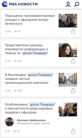 - В новости РИА «Новости» о публикации архива подчёркивается, что консорциум журналистов финансируется «в частности, одним из фондов Джорджа Сороса». Из фигурантов расследования упомянули только президентов Украины и Азербайджана Владимира Зеленского и Ильхама Алиева. Также агентство написало семь новостей про офшоры Зеленского и упомянуло певицу Шакиру, премьер-министра Чехии Андрея Бабиша, президента Кении Ухуру Кениатта, бывших и действующих президентов стран Латинской Америки, Конго, Кабона, Бахрейна и Катара.