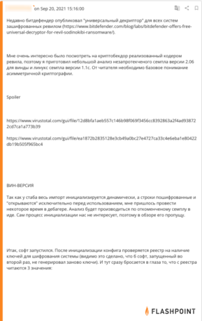 По сообщениям сотрудников Flashpoint, эта новость вызвала бурную дискуссию в сообществе хакеров-вымогателей. Некоторые взломщики вспомнили, как их жертвы соглашались заплатить выкуп, но вскоре почему-то переставали выходить на связь. Один из хакеров сообщил, что лишился таким образом семи миллионов долларов выкупа, который жертва готовилась ему перечислить.