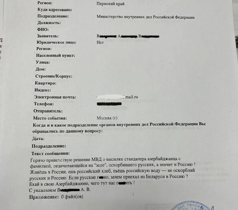 «Горячо приветствую решение МВД о высылке стендапера азербайджанца с фамилией, оканчивающейся на «заде» <…> Ехай в свою Азербайджанию…»