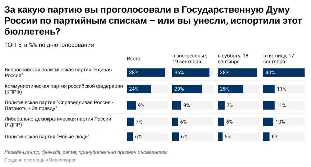 «Левада»: 38% россиян заявили, что голосовали за «Единую Россию»