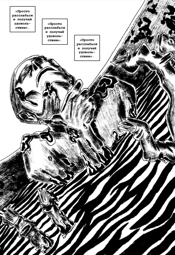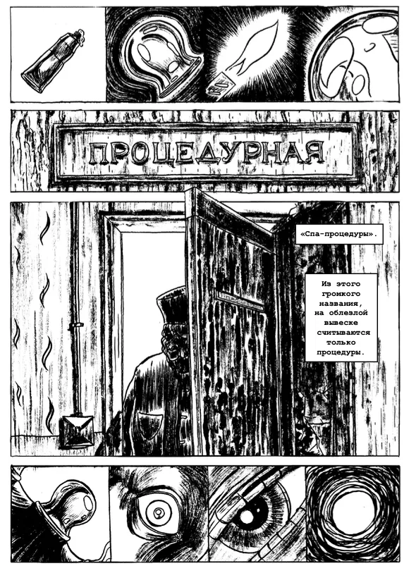 Рисунок Герасимова непрестанно движется от условности к почти что гиперреализму, от апокалиптического китча Здзислава Бексиньского с его агонизирующими куротрупами — к почти эротической болезненной камерности в духе Чарльза Бернса. Если глаза героев вдруг расширяются до мангообразных размеров, то лишь для того, чтобы остекленеть, как банки на спине Стекловидова, и чтобы читатель вообразил невидимую иглу, готовую пробить их белки. Зловещие и почти барочные контрасты рисунка подкрепляет аскетичный леттеринг — история Терлецкого набрана бесплатным шрифтом Courier New. Наверное, это случайная находка, но она удачно вписывается в общую атмосферу нищеты и какой-то неустроенности, пронизывающей санаторий-отель. От некоторых панелей, сотворенных Алексеем, и вовсе веет почти хайдеггеровским ангстом, пусть на них вроде бы не изображено ничего необычного. Но только всмотритесь в этот микросюжет с женщиной, выходящей из бассейна.
