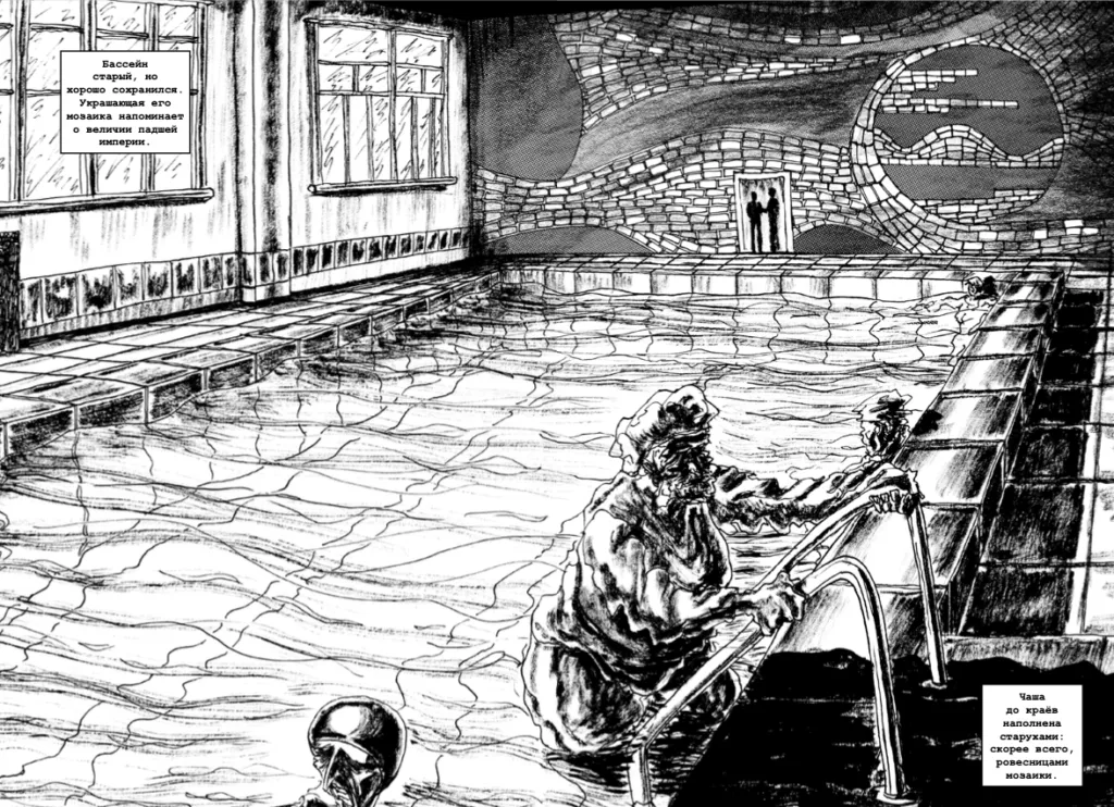 Каждый, кто бывал в постсоветском бассейне, тут же вспомнит это чувство неуюта, стремящегося к тревоге, которое вселяет отражение плитки в стоячей хлорированной воде. Рябь воды, поднятая грузными телами, заставляет рябить все пространство вокруг себя, а тучная женская фигура предстает вывернутым наизнанку традиционным сюжетом о купальщице. Афродита «Отеля „Лето“» — повариха из школьной столовой, которую так боялась возлюбленная главного героя, а рассказчик лишь подкрепляет нашу тревогу словами: «твой мозг отказывается верить, что эти уродливые туши все еще люди». Эта реплика еще отзовется эхом в развязке комикса: «Один из твоих глаз вытекает наружу, нет восьми зубов и часть плоти сгнила. Но это ты».