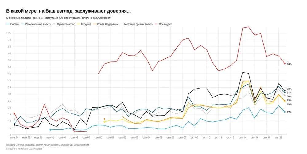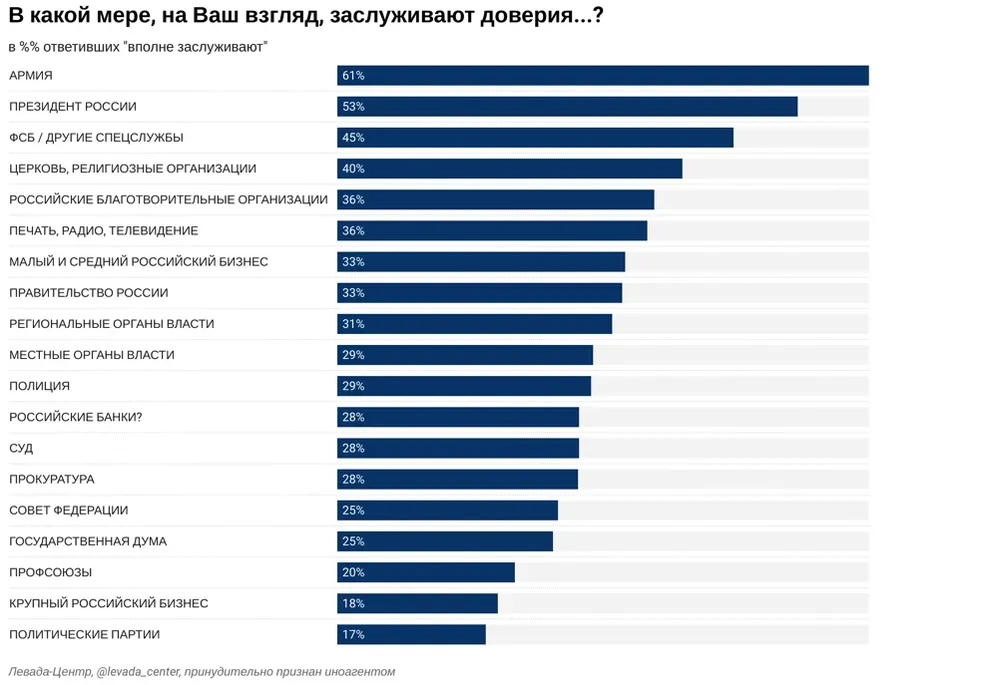 Согласно результатам опроса, меньше всего россияне доверяют политическим партиям (17%), крупному бизнесу (18%), профсоюзам (20%), Госдуме и Совфеду (по 25%). В целом же социологи наблюдают снижения уровня доверия не только к президенту, но и к другим политическим институтам: так, в 2017-м о доверии к Госдуме заявляли 33% респондентов, правительству — 35% (сейчас 33%), политическим партиям — 17%. Та же тенденция наблюдается и в отношении силовых структур: если в 2017 году армии доверяли 69%, а ФСБ и другим спецслужбам — 57%, то в 2021 году эти показатели составили 61% и 45% соответственно.