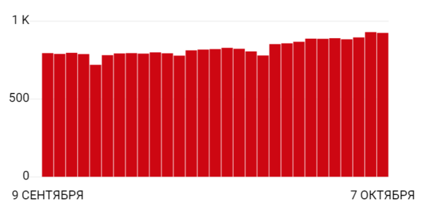 Так, 6 и 7 октября от коронавируса официально умерли 929 и 924 человека, что является абсолютным рекордом за все время с начала появления инфекции в России. Начиная с 21 сентября этот показатель почти ни разу не опускался ниже отметки в 800 смертей в день. Общее количество погибших от Covid-19 на 7 сентября, по данным оперштаба, составило 213 549 человека.