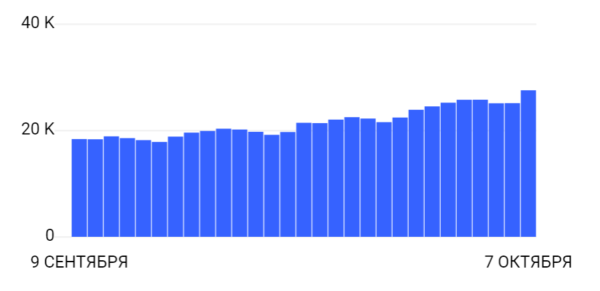 Кривая с ежедневными данными о количестве заболевших также стремительно растет вверх. Оперштаб сообщает, что в России за прошедшие сутки было зафиксировано 27 550 новых случаев, что является рекордом в показателях суточной заболеваемости с начала 2021 года. Официально всего с начала пандемии в России заболели 7 690 110 человек.
