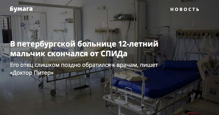 В городской детской больнице № 5 имени Филатова в Петербурге от СПИДа умер 12-летний мальчик из Хабаровска. Его отец слишком поздно узнал о ВИЧ-положительном статусе сына и обратился к врачам. Подробности этой истории приводит «Доктор Питер».