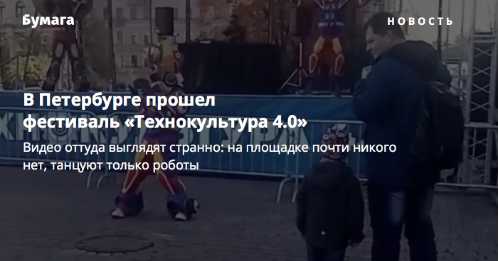 В Петербурге прошел фестиваль «Технокультура 4.0». Видео оттуда выглядят странно: на площадке почти никого нет, танцуют только роботы. «Бумага»