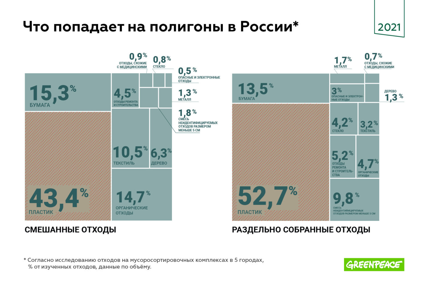 «Гринпис» с июня по август изучал на мусоросортировочных станциях в Новосибирске, Нижнем Новгороде, Егорьевске, Ижевске и Перми так называемые «хвосты», то есть остатки отходов, которые после сортировки вместо переработки попадают на полигоны или мусоросжигательные заводы.