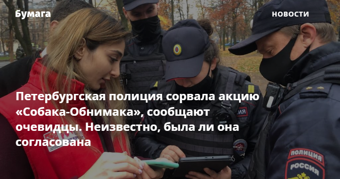 Неизвестно, была ли акция «Собака-Обнимака» согласована с властями Петербурга. Согласно «антиковидному» постановлению № 121, до конца октября в городе запрещены мероприятия численностью более 75 человек без согласования с комитетами. В списке согласованных мероприятий акции нет. «Бумага» направила запросы в администрацию Василеостровского района, организаторам акции и в пресс-службу МВД по Петербургу и Ленобласти.