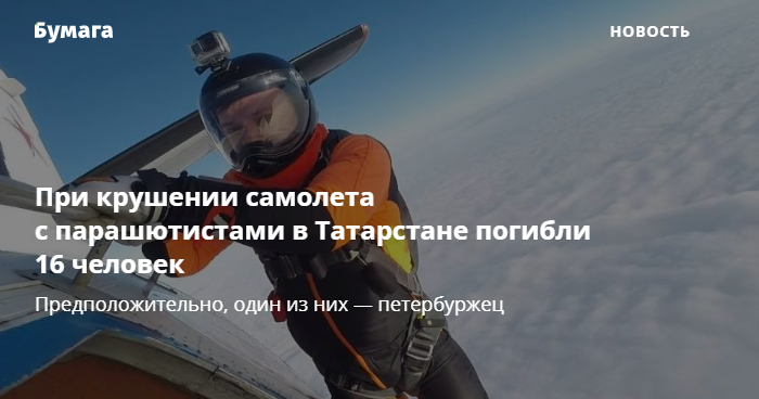 Утром 10 октября в Татарстане упал легкомоторный самолет L-410, принадлежащий местному мензелинскому аэроклубу и перевозивший парашютистов. На борту находились 22 человека, из них 16 погибли, шестеро пострадали и госпитализированы, сообщает правительство республики.