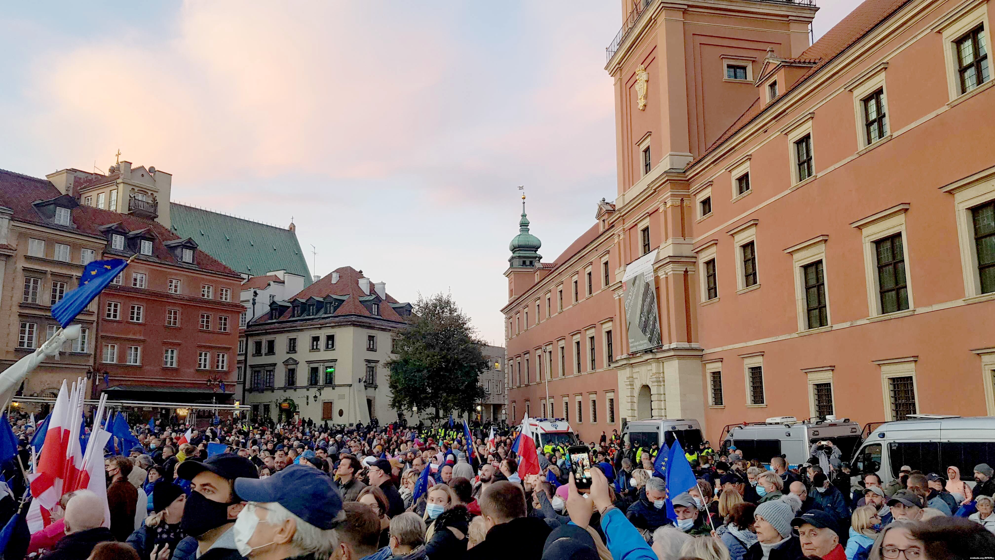 В Польше тысячи людей вечером в воскресенье, 10 октября, протестовали против решения Конституционного судa о приоритете польской конституции над законодательством Евросоюза. Как сообщает "Немецкая волна", в Варшаве демонстранты собрались на Замковой площади под лозунгами "Мы остаемся!", "Мы – Европа!".
