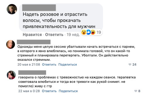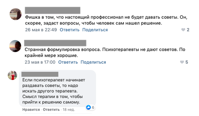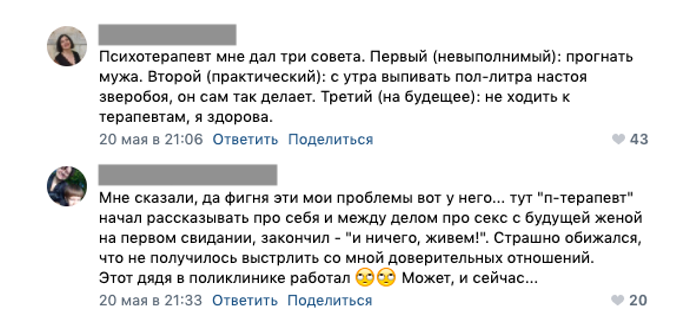 Читатели также рассказывали о случаях, когда психотерапевты давали советы, исходя из своего жизненного опыта, и сравнивали проблемы клиенток со своими. И также обесценивали чужой опыт.