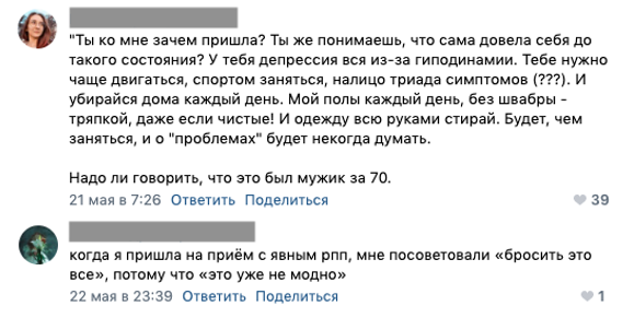 Скриншот из официального сообщества «Таких дел» во «ВКонтакте» В подобных ситуациях психотерапевтов можно считать профнепригодными, по мнению Сигитовой: «Они не понимают, как устроены РПП и депрессия, и считают, что это решается просто».
