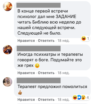 Скриншот из официального сообщества «Таких дел» во «ВКонтакте» Но специалисты не могут навязывать убеждения из собственной системы ценностей. «Религия приглашает таких психотерапевтов проповедовать их веру. Они это несут в свой кабинет. Это тоже профнепригодность. И никаких рычагов убрать подобных людей из профессии нет», — рассказывает Сигитова.