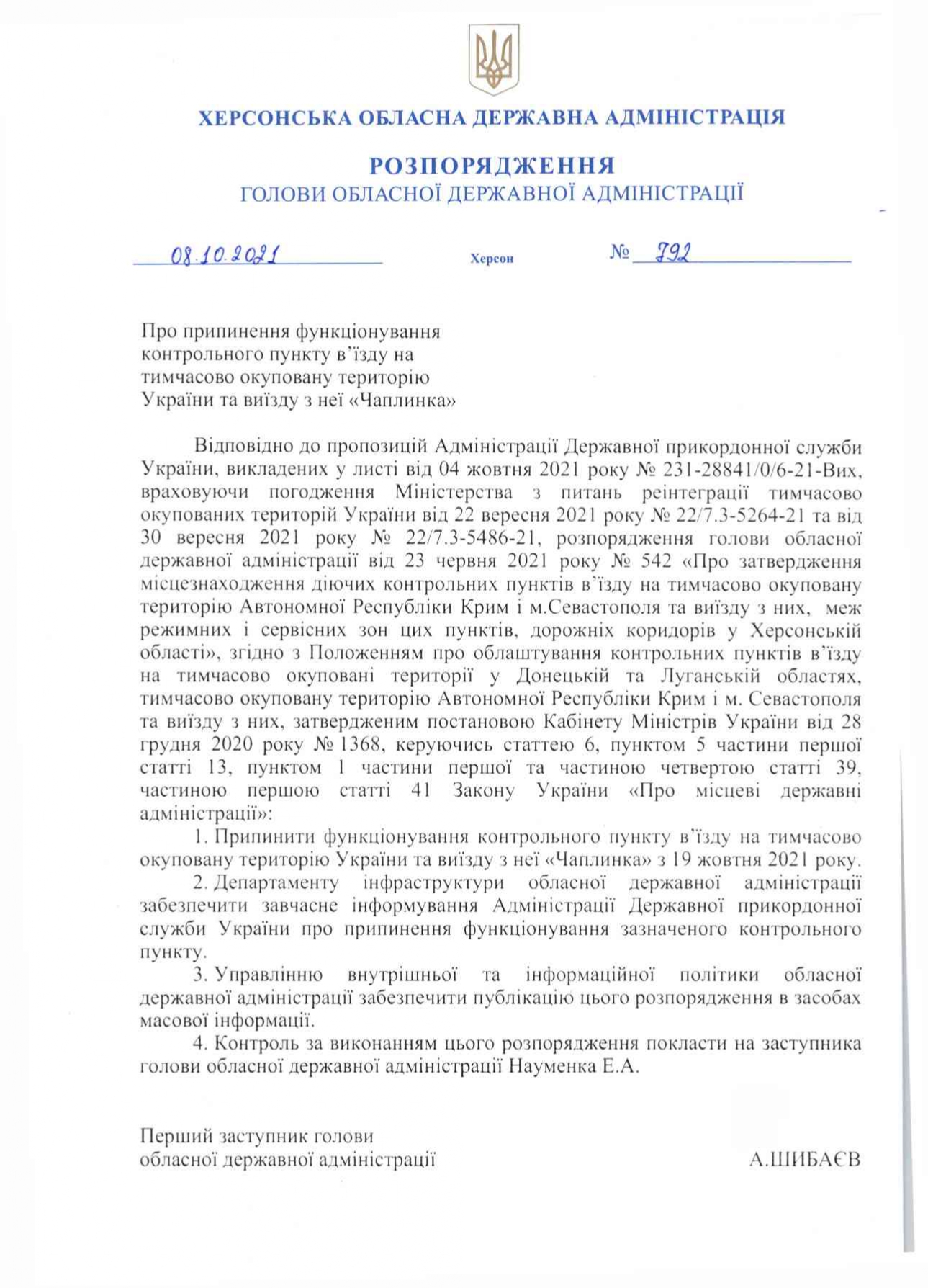 оккупированную территорию Украины и выезда из нее «Чаплинка» с 19 октября 2021», – указано в документе, опубликованном на сайте ОГА.