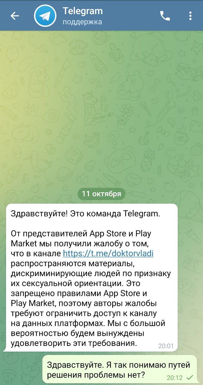 Как видно на опубликованных скриншотах, с Поздняковым связалась служба поддержки Telegram и рассказала, что, по версии магазинов приложений, в канале Позднякова «распространяются материалы, дискриминирующие людей по признаку их сексуальной ориентации».