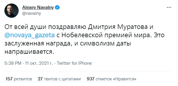 Находящийся в заключении политик Алексей Навальный поздравил «Новую газету», ее главреда Дмитрия Муратова, а также филиппинскую журналистку Марию Ресса с присуждением Нобелевской премии мира. Обращение Навального опубликовано в его твиттере.