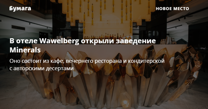 В историческом доме Вавельберга на Невском проспекте, 7–9 при пятизвездочном отеле Wawelberg открыли кафе и ресторан Minerals, рассказали «Бумаге» представители проекта. Заведение работает одновременно в нескольких форматах: это и вечерний гастрономический ресторан, и более демократичное кафе, и кондитерская с авторскими десертами.