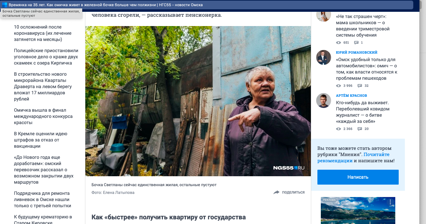 Жительница Омска Светлана Чернова с 1986 года живет на территории промышленной зоны в железной бочке. Завод, где она работала, закрылся, и обещанного благоустроенного жилья Чернова не получила до сих пор,. Об этом рассказало издание Ngs55.ru.