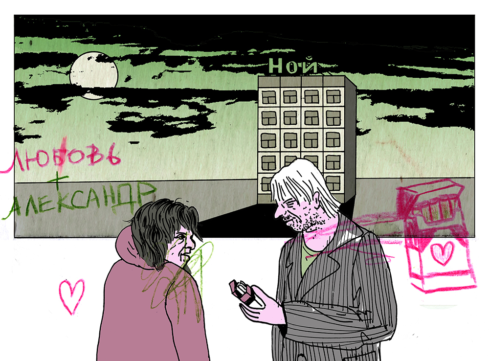Причины, по которым Александр оказался на улице, он вспоминать не любит, упоминает только семейные дела, бывшую жену и вино. Дома он не был около четырех лет, но на улице провел только одно лето — настоящее везение с точки зрения бездомности. Жил в 90 километрах от Москвы, то один, то с компанией, ночевал «на трубах» (теплотрасса. — Прим. ТД). О женщинах не думал. «Понимаете, все эти мысли заливаются вином», — говорит он. Оказавшись в «Ное», Александр вылечился от алкогольной зависимости и встретил любовь — буквально. Его нынешнюю партнершу зовут Любовь.