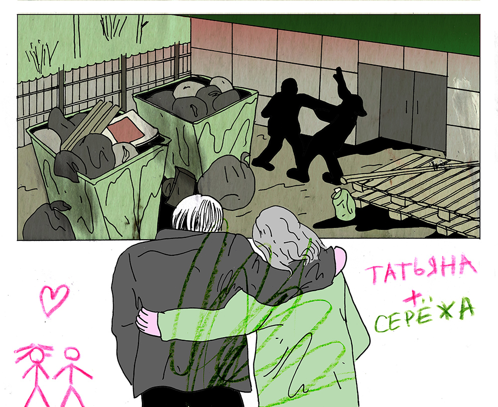 Так же спокойно, как избиения гражданского мужа, Татьяна описывает сексуальные отношения: «С презиками я за свою жизнь только два раза трахалась. С Сережей мы когда спали, он в меня просто не это самое». Кажется, что улица — самое неподходящее место для секса, и, по словам Кузинер, многие вообще не верят, что у бездомных может быть секс. «Бездомных экзотизируют: они не могут заниматься сексом, не могут любить, ведь они живут на улице. Но в этом плане они такие же, как мы, тоже испытывают чувства и могут кого-то желать», — говорит Кузинер.