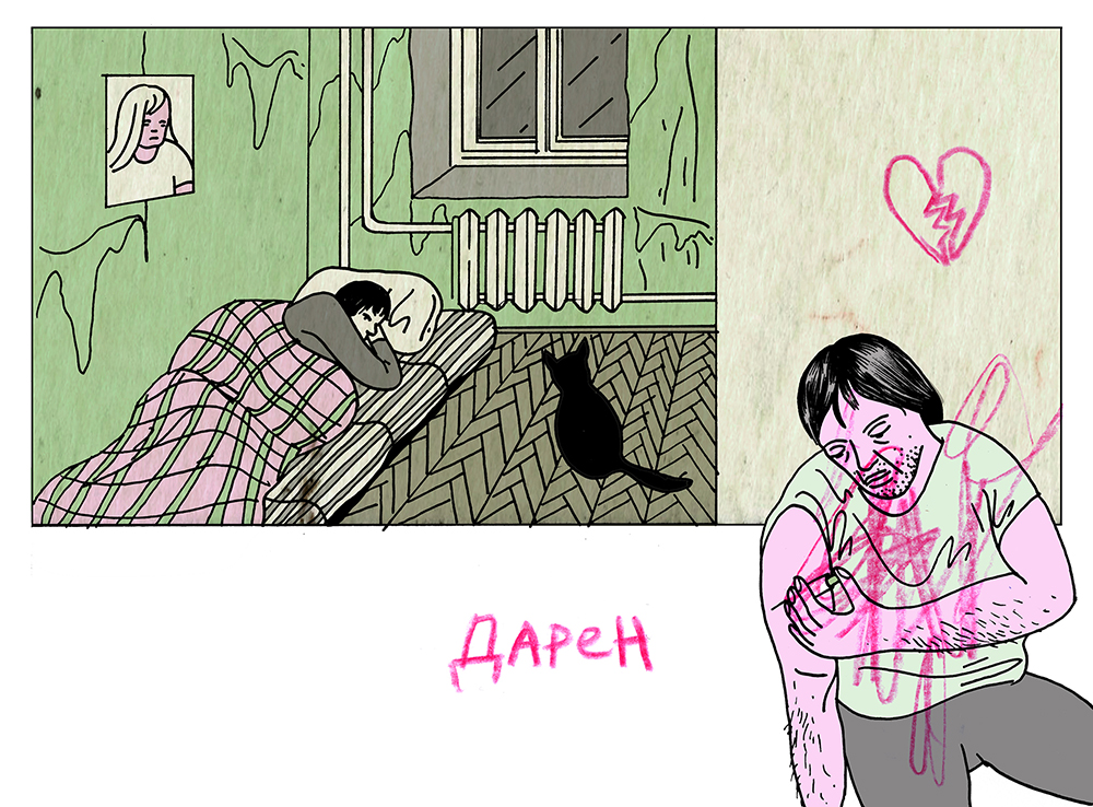 Через несколько дней Дарен присылает сообщение, что в конце недели переезжает в комнату дальней знакомой, куда его пустили жить за квартплату. С собой он забрал вещи в картонной коробке, тубус с рисунками, кота и любовь к бывшим — жене и комнате.