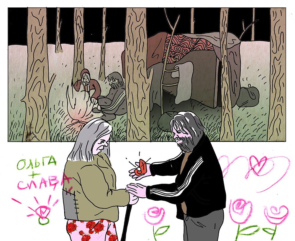 Ольга и Слава жили в подвалах, на чердаках, в шалаше, который сами построили. Из-за травмы Ольга не может далеко ходить, поэтому Слава отправлялся на заработки один: собирал бутылки и банки. Сейчас он работает на стройке дома в Ленобласти, там и живет. По выходным приезжает к Оле в «Ночлежку». Привозит ее любимый кофе и отдает весь заработок, чтобы не пропить. «Бывает, бухает. Я его терпеть таким не могу, — говорит Ольга. — Не хочу, чтобы он пьянствовал, потому что зима на носу, нужно комнату подыскивать, чтобы он был под крышей». Так они заботятся друг о друге. Но это не любовь.